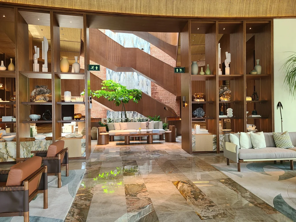 The resort’s lobby serves as the anchor of this narrative – a space that embodies the island’s biodiversity and cultural hybridity, with its mesmerising waterfall and striking sculptural staircase. Dubbed ‘The Meeting of All Palms’, the lobby’s design of contrasts merges sculptural forms, curated textures and artisanal finishes.
