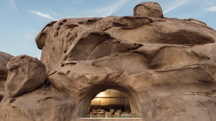 The interiors are crafted with raw stone, natural textures, and an earthy palette, designed to reflect and complement the surrounding terrain. www.oppenoffice.com
