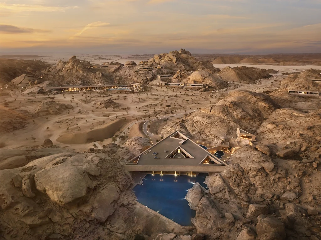 DESERT ROCK IS part of an ambitious ecotourism development in Saudi Arabia, set among 11,000 square miles of islands, beaches, desert, mountains and volcanic areas. Carved directly into the Hejaz mountains, the resort comprises 60 keys, including villas, ridge-side suites, and a series of rooms excavated into the rock itself.