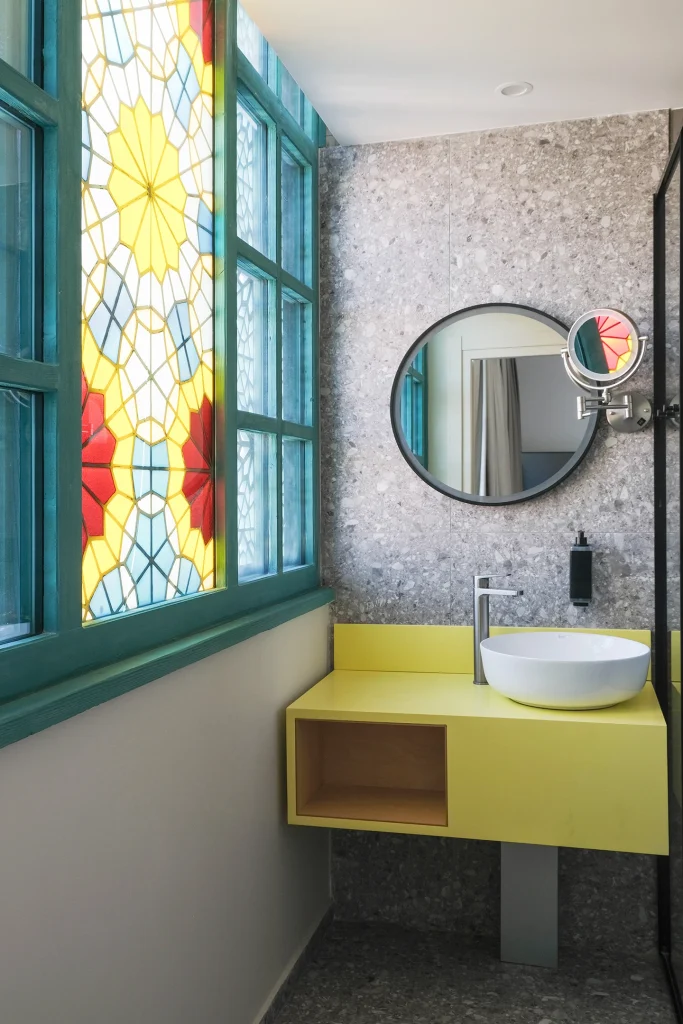 Set within a beautifully restored building in Old Tbilisi, the hotel preserves original architectural details such as a cast-iron spiral staircase, turquoise balconies, and stained-glass windows, while introducing contemporary design elements. Playful details define the interiors, from a striking yellow lounge seat to plant-filled vases and a two-level reception desk designed for accessibility.