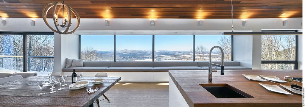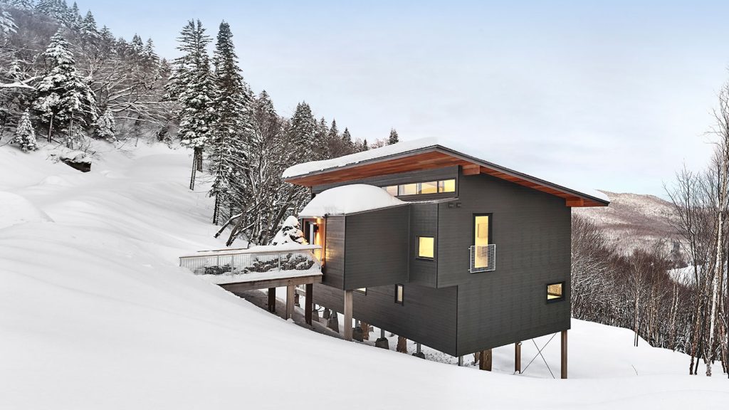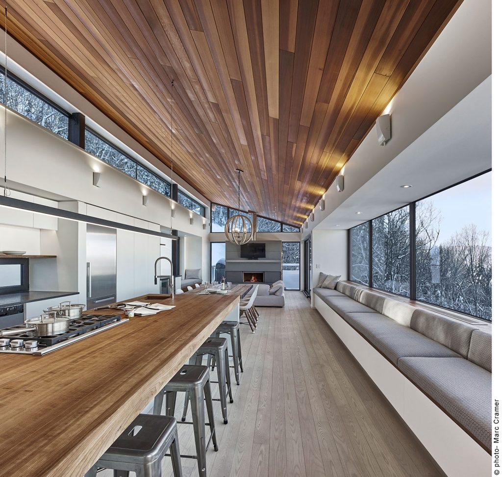 One of the highest buildings in the Laurentian Mountains of Québec, this family ski chalet has 100-mile panoramic views over Lac Archambault, enjoyed through the 27ft bay window in the kitchen/ dining room. Built on cedar stilts to limit its impact on the landscape and allow snow to melt underneath it, the entire building is clad in dark-stained cedar, with a metal roof.