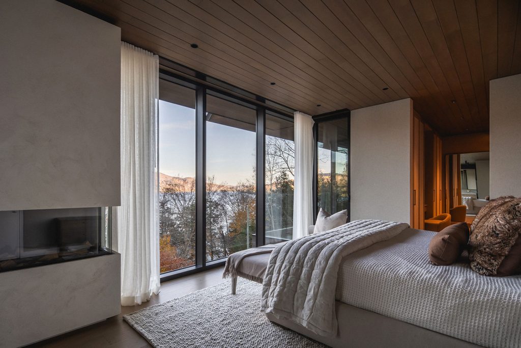 Strict environmental regulations in Mont Tremblant, Québec, meant this contemporary mountain chalet was allowed no visible outdoor lighting. Its name comes from the rooflines that evoke an arrow, while concealing a lower garden level entirely from view. The body of the house is clad in wood and dry-stacked stone, their soft tones blending with the surrounding forest.