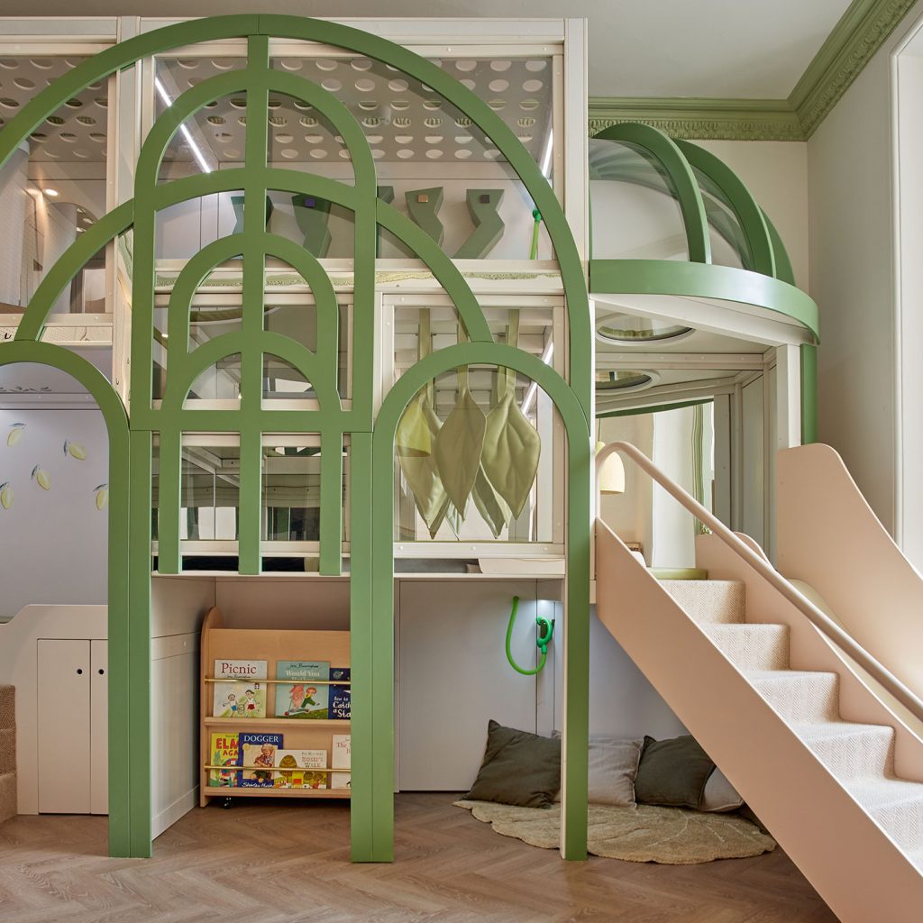 This project transformed a Georgian townhouse into a whimsical nursery, celebrating English country estates. The design features a pastel-rich palette, bespoke furniture, and sculptural installations, including the standout Illuminated Orchard—papier-mâché fruit lampshades that double as light sculptures, creating a storybook atmosphere.