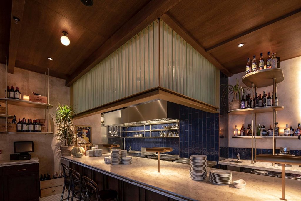 Batard represents a milestone in small-scale atmosphere building, designed to evoke ease, familiarity, and quiet elegance. The restaurant features white marble tabletops, robust built-ins, and sun-worn blue awnings, creating a sense of permanence and an immediate, lived-in quality.