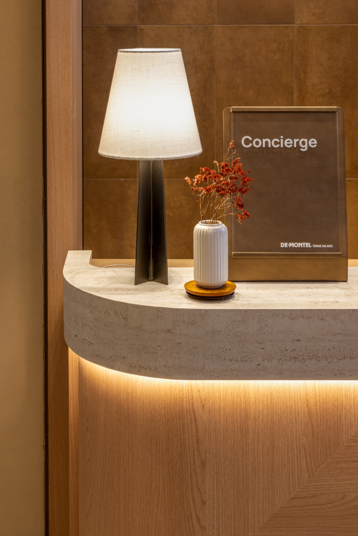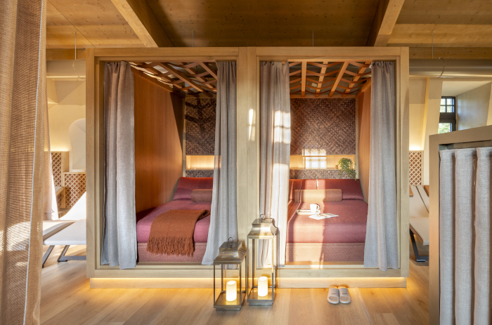 Just beyond the entrance, the reception opens in an embrace of amber melamine panels, instantly putting guests at ease in a moment of welcoming serenity. The relaxation areas are sensory oases dominated by a suspended ceiling made of ennobled panels with a maple finish, completing the spatial concept and distributing the lighting: a silky light radiates, like the calm of a veiled dawn gently caressing the space with subtle and soothing elegance. The color palette of the panels acts as a link between the restored lime-plastered historic walls and the new interior language.
