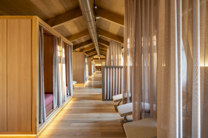 THDP reinterprets the space using contemporary and sustainable materials, choosing the memory of the old stables as the common thread. Saviola’s ennobled panels, a certified expression of circular economy, combine eco-responsibility with sensory comfort: the light finishes recall the worn leather of saddles and the color of hay, while the darker tones evoke the sturdy barn doors. In this way, contemporary materials become a bridge between memory and innovation, while also ensuring the technical performance required by a modern thermal complex.