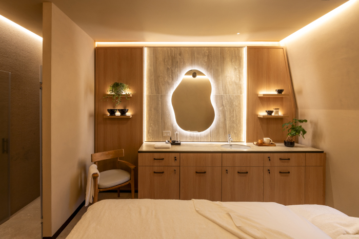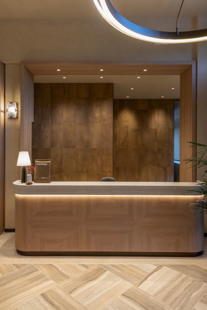 In the vanity areas and private bathrooms, surfaces are warmed by the enveloping tone of Saviola’s recycled ennobled panels. A honey-colored oak spreads a cozy warmth, like golden light filtering through branches on an autumn morning. It invites calm and conviviality, tinting the space with a sweet balance. Here, the panel serves as cladding for walls and consoles, creating a dialogue between backlit mirrors and satin-nickel fixtures with a wooden base that absorbs and reflects the light, evoking a homely atmosphere.
