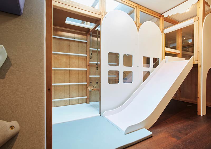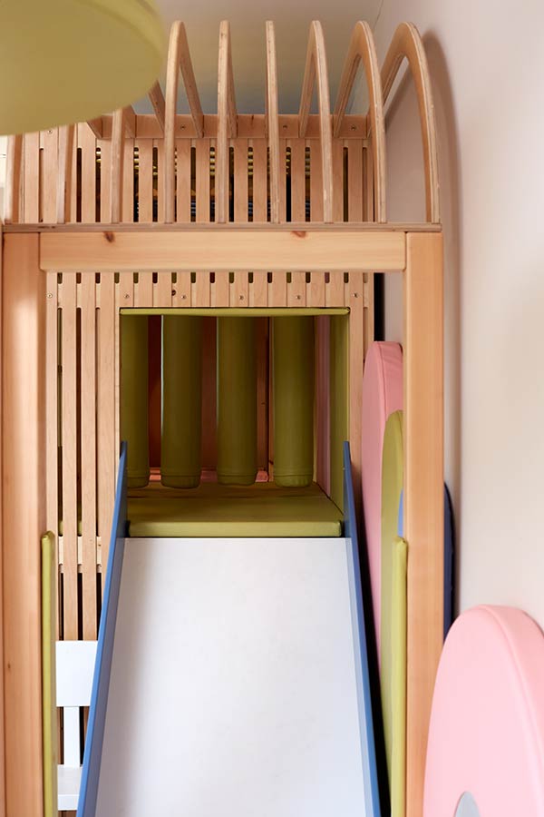 This bespoke wooden structure introduces playful pops of colour while retaining a natural aesthetic through its warm timber frame. On the upper level, soft play obstacles encourage climbing and exploration, while the sleek HIMACS slide offers a joyful way back down.