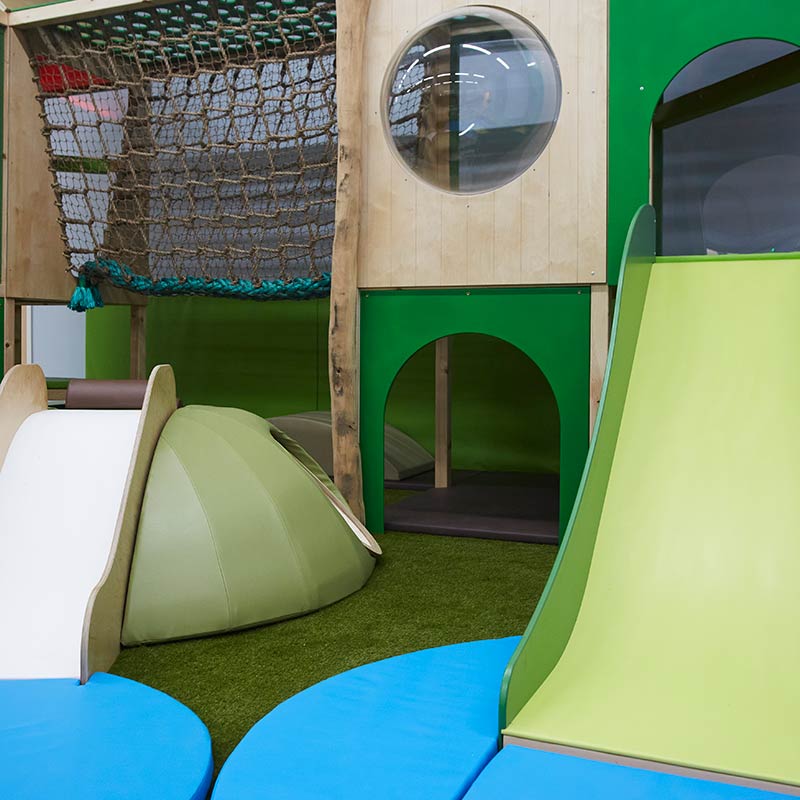 This play space was designed to spark wonder and imagination with HIMACS slides, climbing walls, activity walls and sensory features spread across two floors. Children can navigate through, up, down and around the climbing frame which curves and meanders throughout the whole space. The natural colour scheme, digitally printed flooring and graphics on the wall add to the immersive experience for families to enjoy.