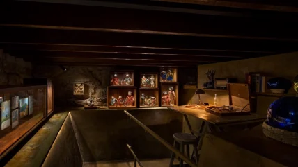 After passing through a series of galleries and restored rooms of the house, guests descend a set of stairs into a recreation of Kahlo’s hidden retreat. Here, Kahlo was free to write, paint, think and sketch. The candlelit room includes a collection of objects, furniture and textiles that belonged to Kahlo, including dolls, paintings, a bug collection, her desk and paints, as well as family stories told across generations with photographs and letters. Using Kahlo’s original sketches and photographs of the butterflies and insects, the LAB at Rockwell Group designed an interactive replica of her microscope. This allows visitors to peer inside and observe the very specimens Frida would have studied.